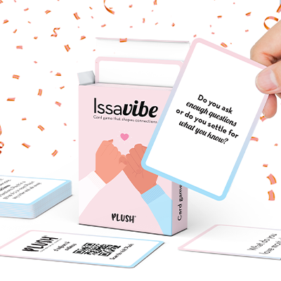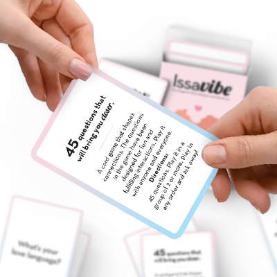 IssaVibe is a card game with 45 thoughtfully curated questions that you can play with your partner, friends & family. Play it with anybody, with participants of 2 or more, and get to know them inside out. Here's your subscription for endless fun on every occasion. The game might last for 30+ minutes, but the meaningful connections it builds last forever! 🩷